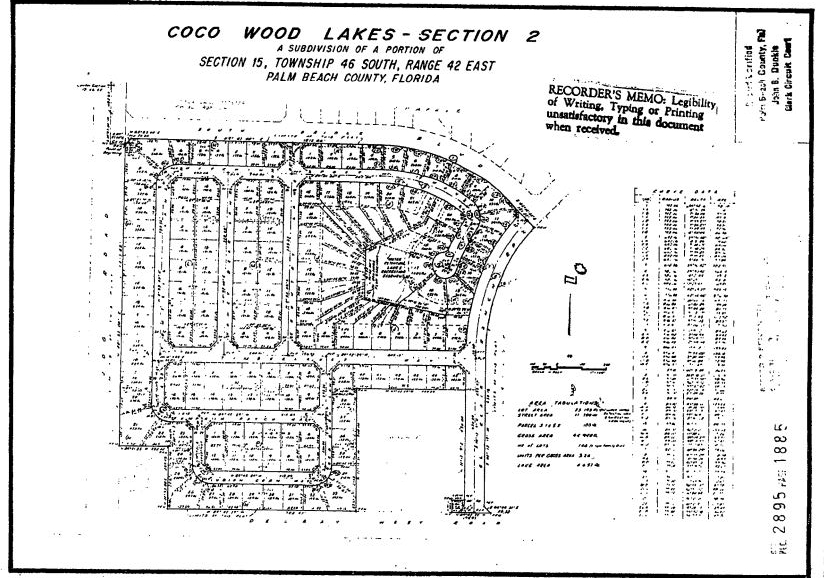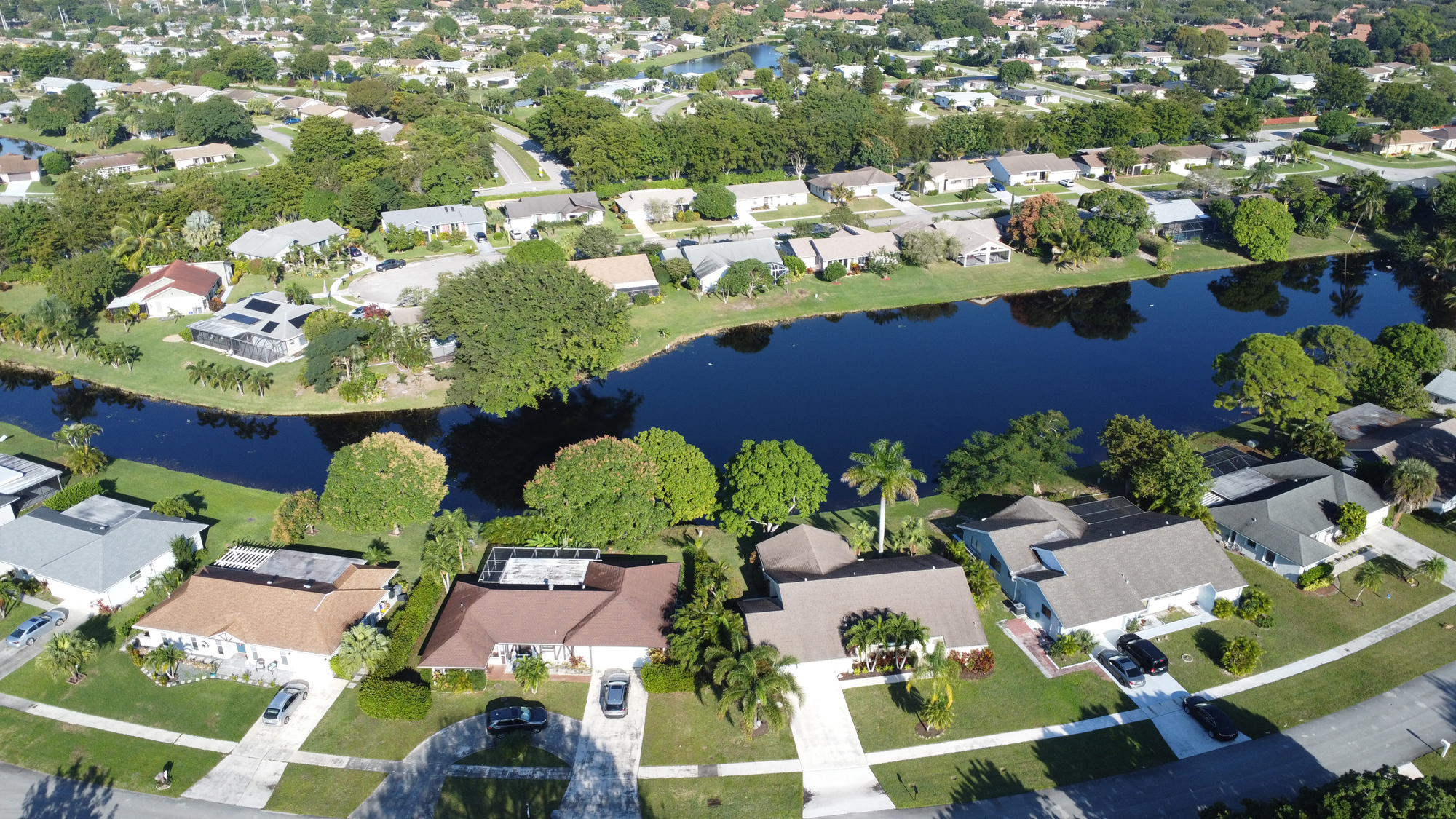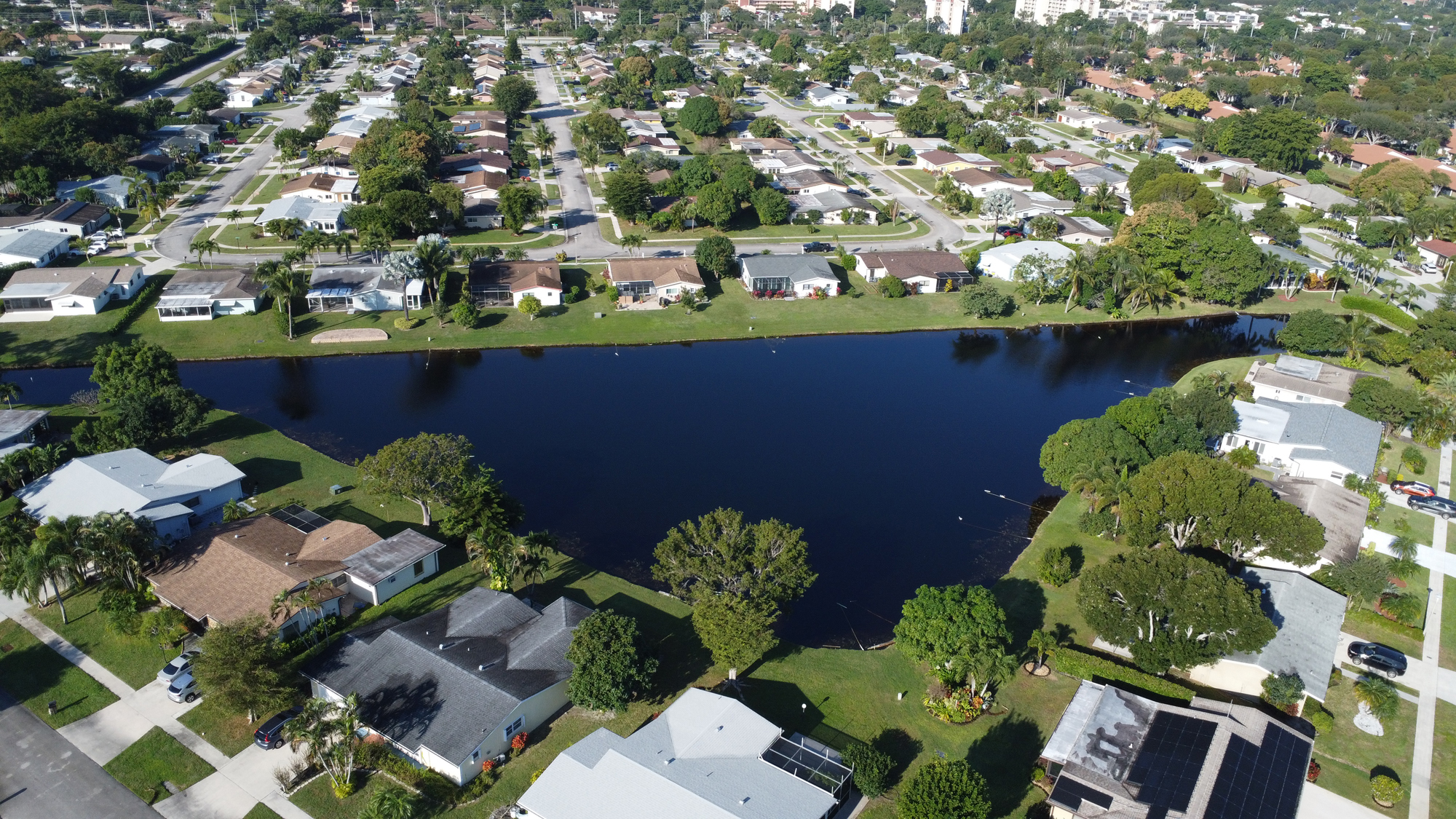 This screenshot from the Palm Beach County GIS Ownership Records viewer shows parcel boundaries (yellow). The clubhouse is a separate parcel highlighted in red. Around the nearby lake, the parcel lines radiate into/through the waterbody in wedge-shaped segments, reflecting an older/private-lot parceling pattern rather than a single “common area” lake tract. In many newer subdivisions, stormwater lakes/ponds are instead platted as dedicated water management tracts/common areas with required maintenance access easements, and post-construction maintenance responsibility typically shifts to the HOA (or a contracted manager).2 3 4