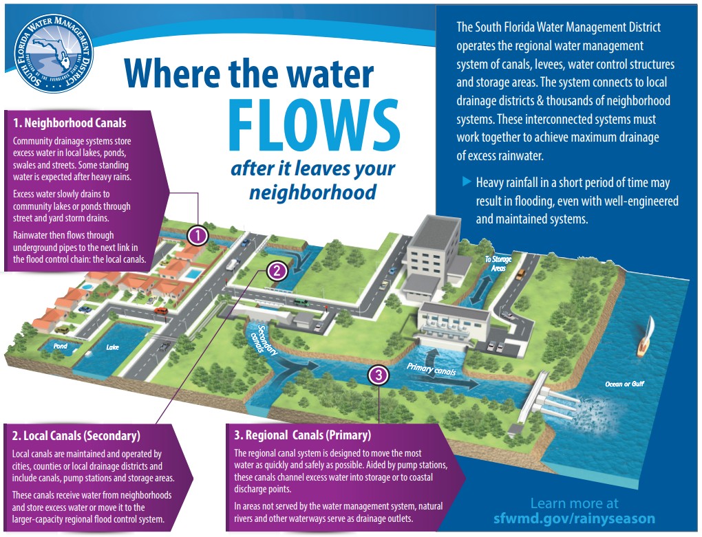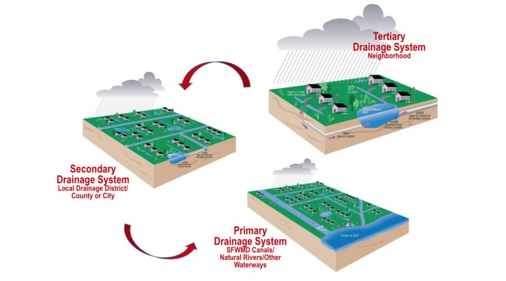 Flood control in South Florida is a shared responsibility and is achieved through an interconnected, three-tiered drainage system. Neighborhood drainage systems, or tertiary systems, are operated by property owners or residential associations. Secondary flood control canals are operated by the Lake Worth Drainage District, and primary flood control is provided by the South Florida Water Management District. The Lake Worth Drainage District works closely with the South Florida Water Management District before, during and after rainfall events to provide flood control for the residents of Palm Beach County. Water managers are continually monitoring weather systems and canal levels in order to proactively respond to heavy rainfall events. In anticipation of a heavy rainfall event, the Lake Worth Drainage District water control structures are opened in order to maintain appropriate water levels in the system. Residential communities are designed to retain water in swales and onsite detention ponds. With prior authorization from the Lake Worth Drainage District, excess stormwater may be discharged into District canals through control structures with fixed or operable weirs to prevent flooding of property.